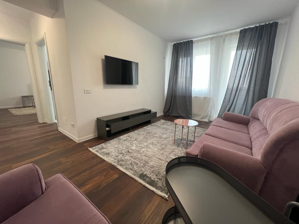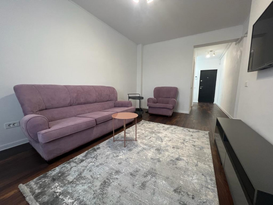 Dispune de un living luminos echipat cu canapea, 2 fotolii, comod si TV smart, dormitor cu pat matrimonial, dressing incapator, 1 baie.