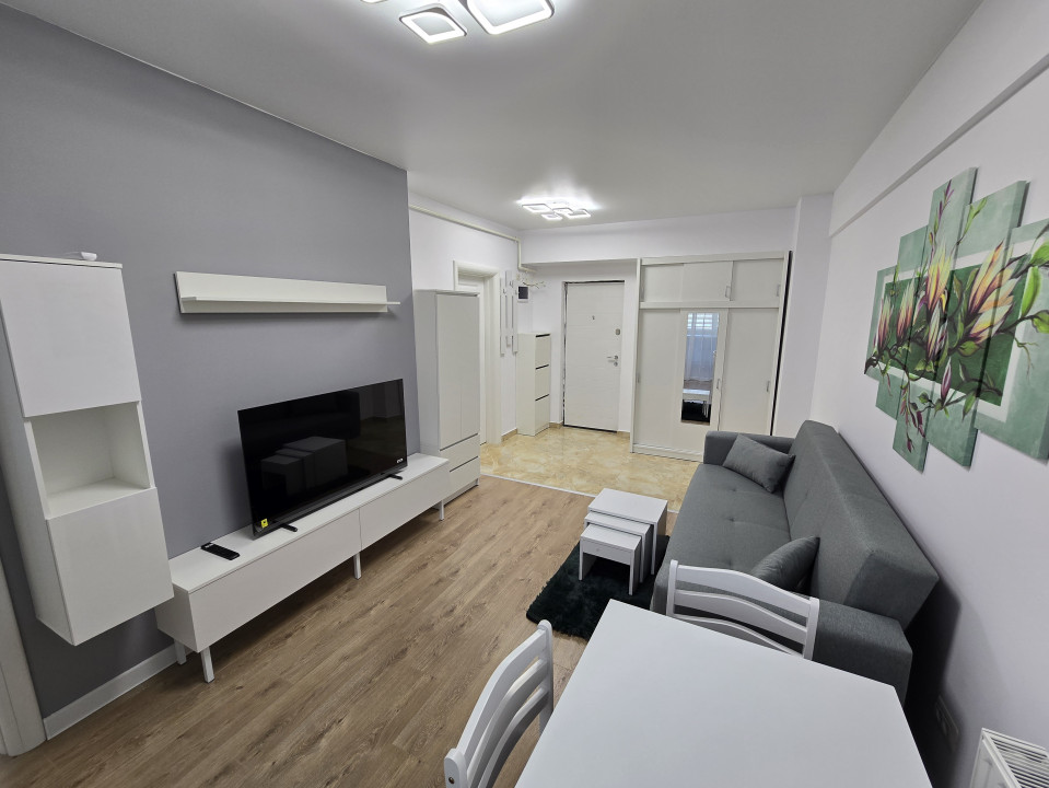 Dispune de un living luminos echipat cu o canapea extensibila, TV, AC masa de 4 persoane si dressing.