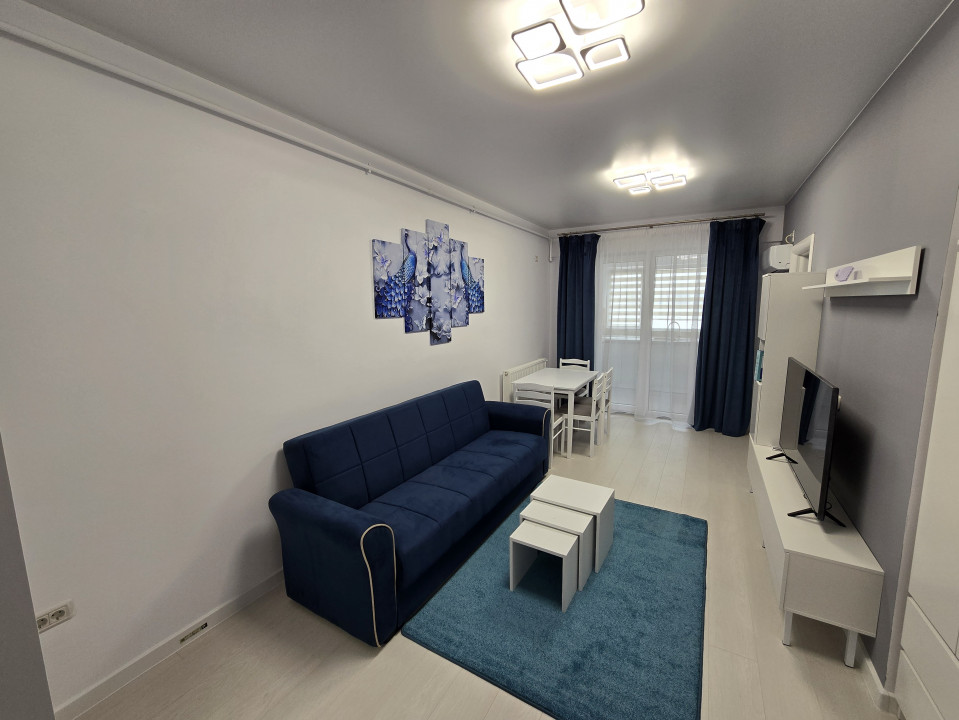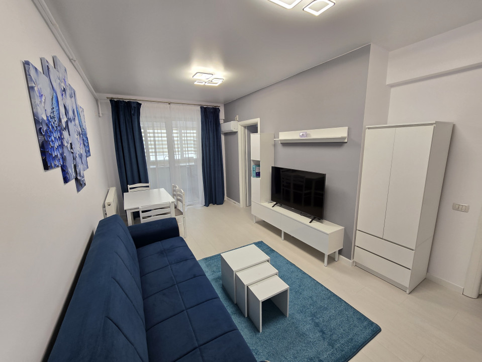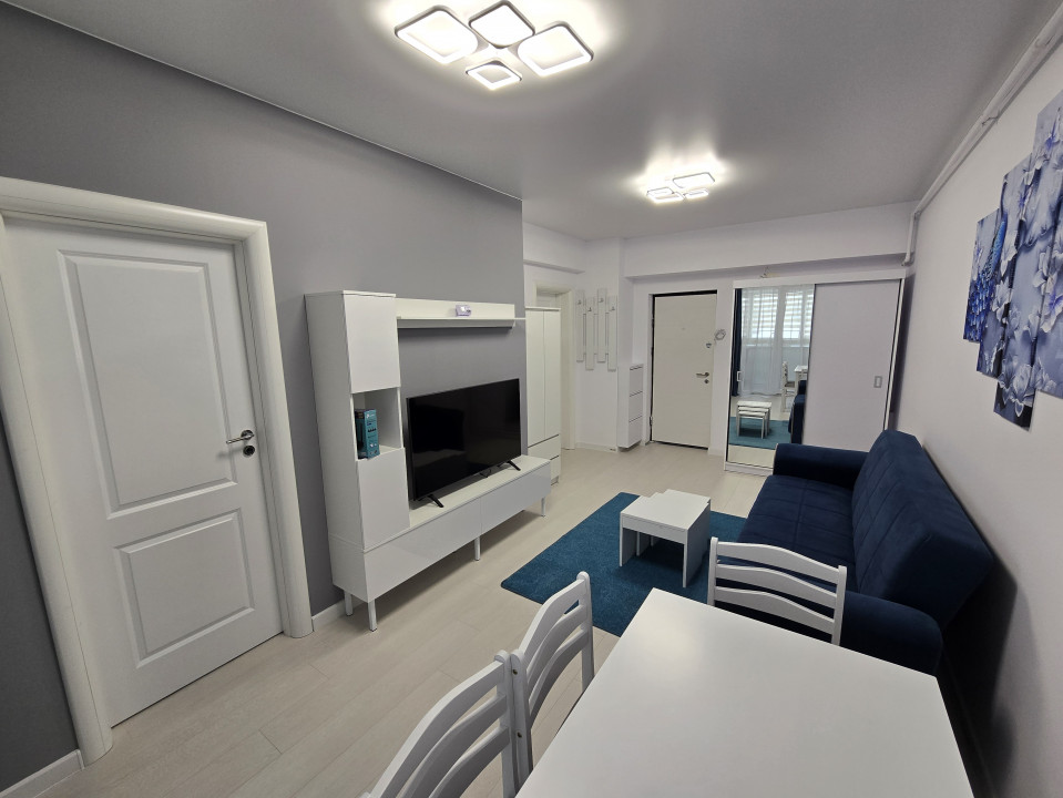 Dispune de un living luminos echipat cu o canapea extensibila, TV, AC masa de 4 persoane si dressing.