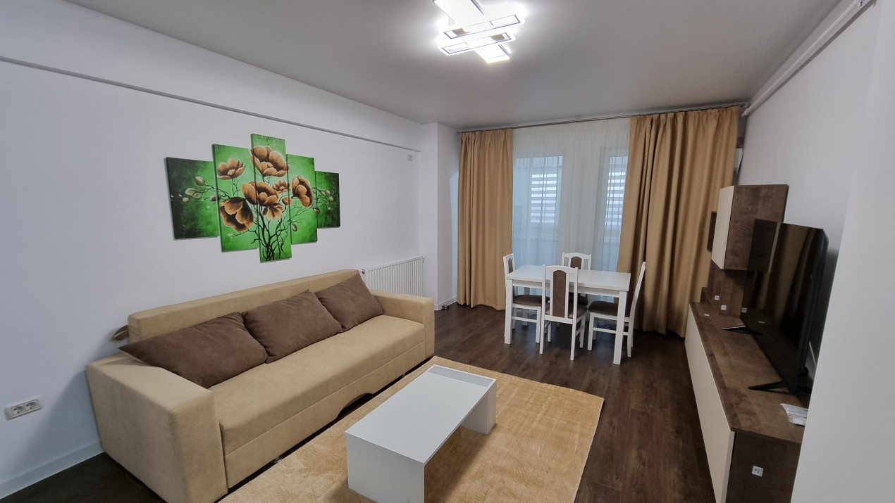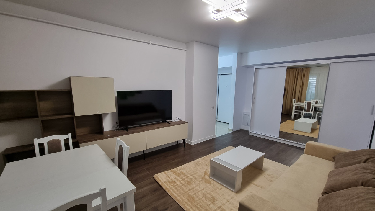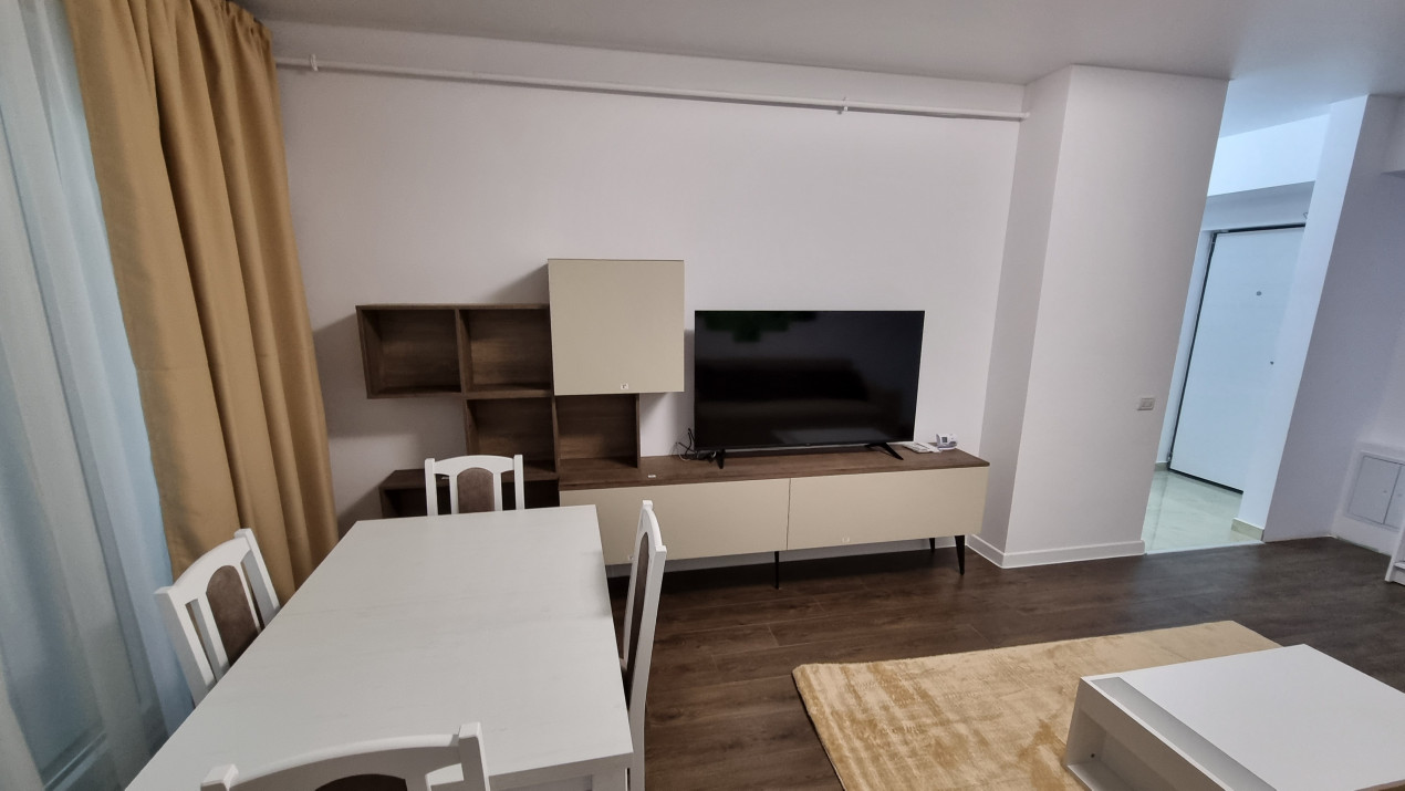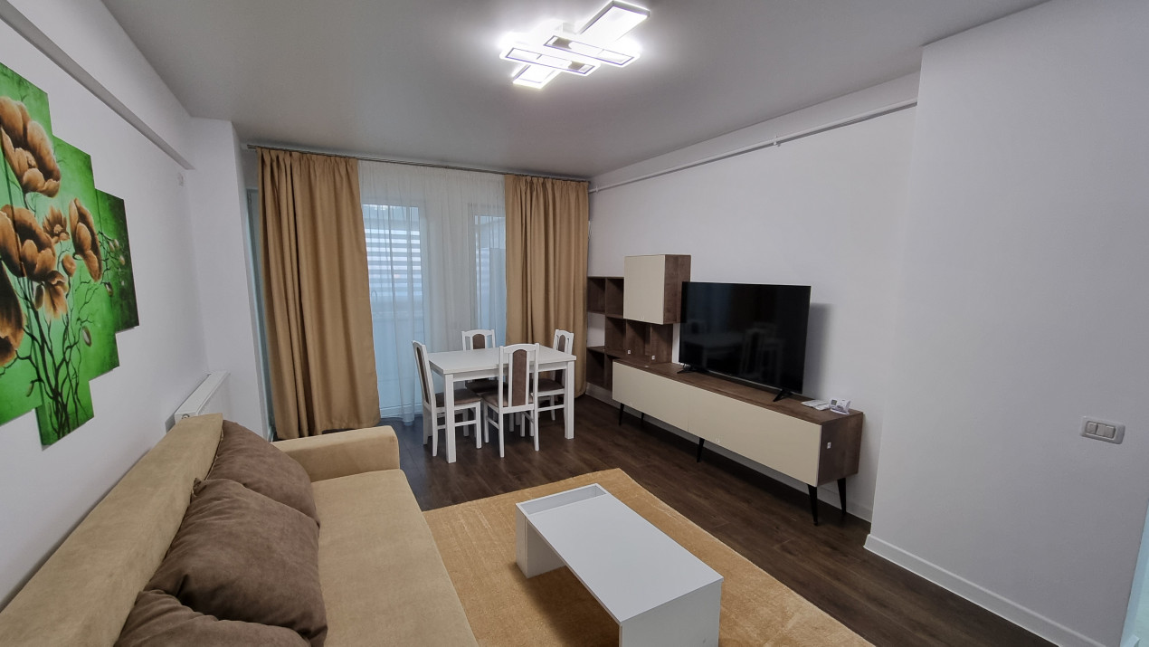 Dispune de un living luminos echipat cu o canapea extensibila, TV, AC masa de 4 persoane si dressing