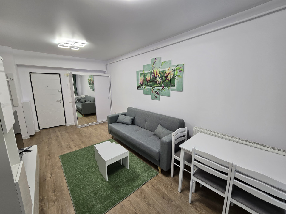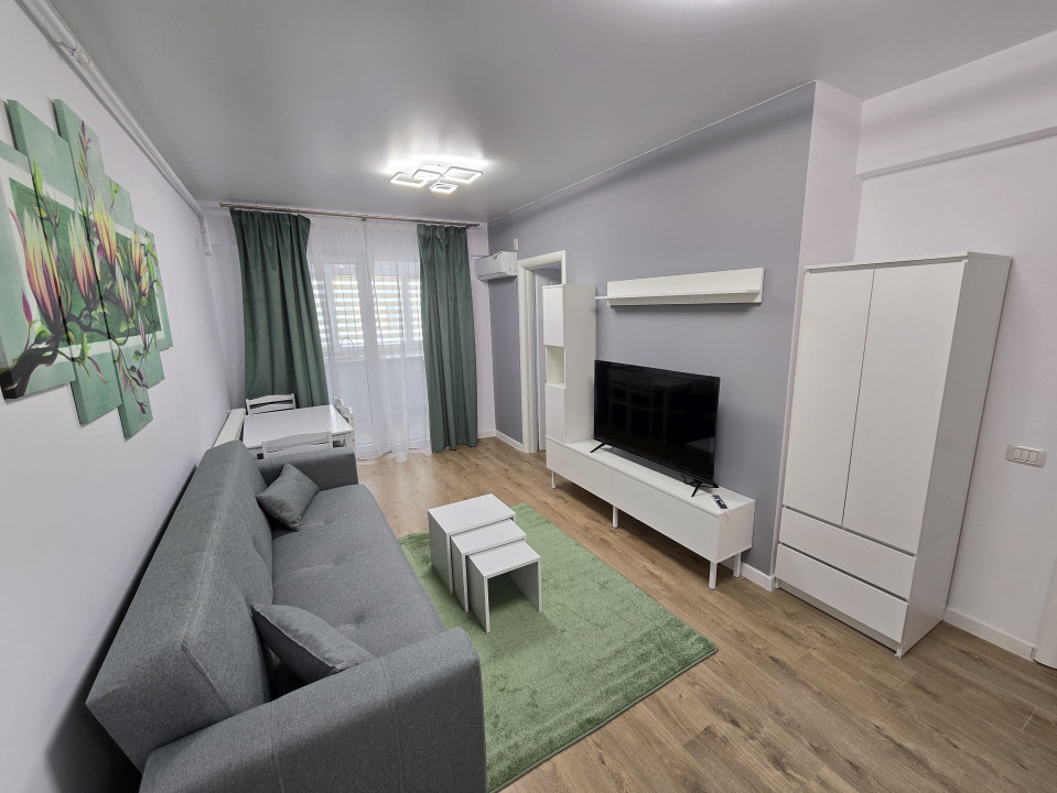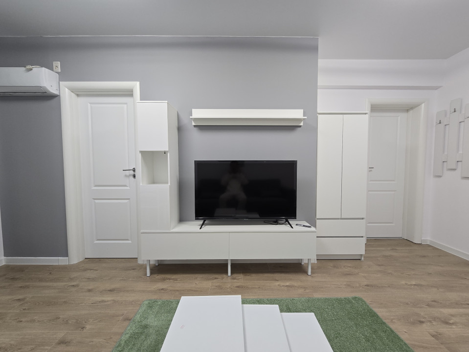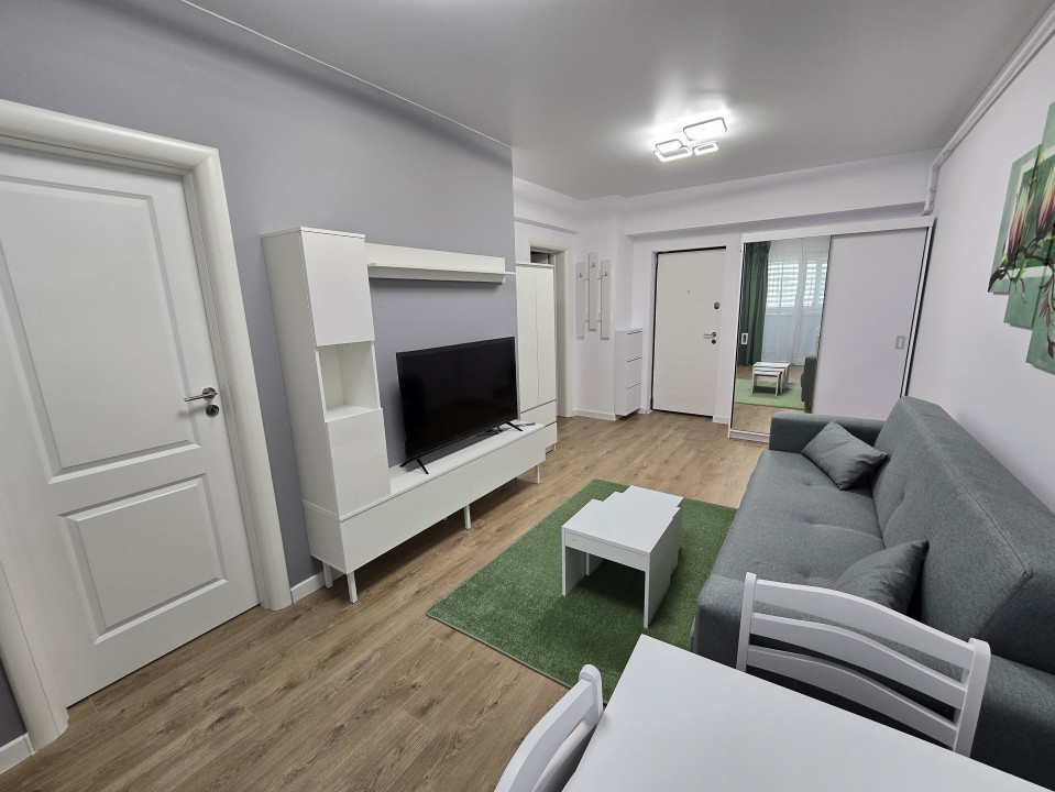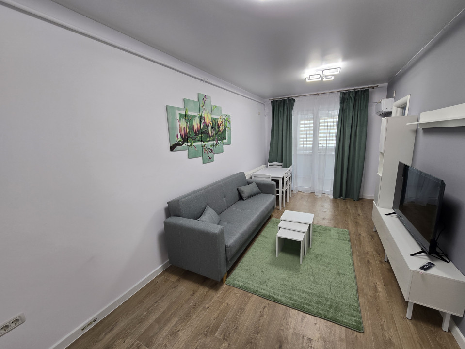 Dispune de un living luminos echipat cu o canapea extensibila, TV, AC masa de 4 persoane si dressing.