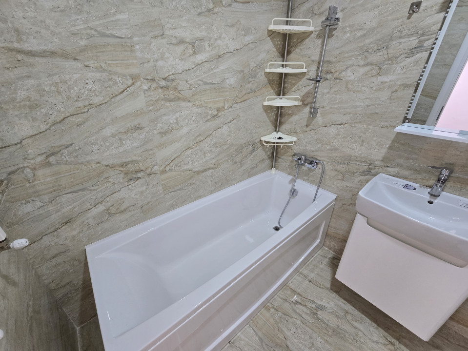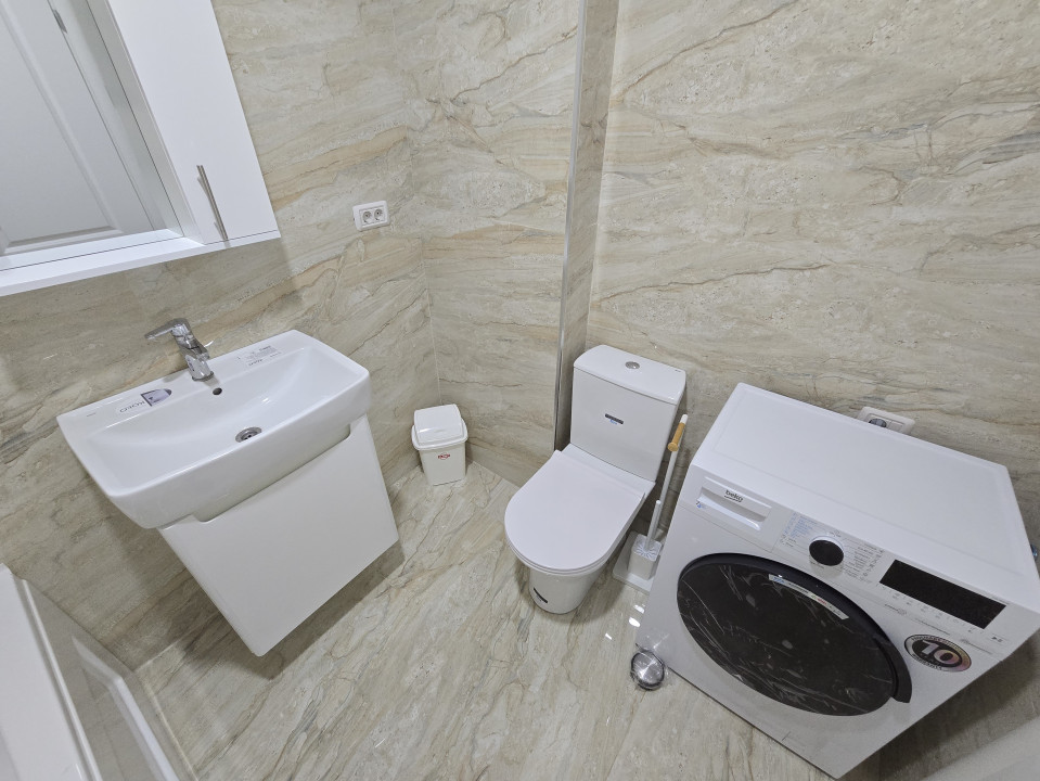 Baie mobilata si utilata cu masina de spalat rufe cu uscator.
