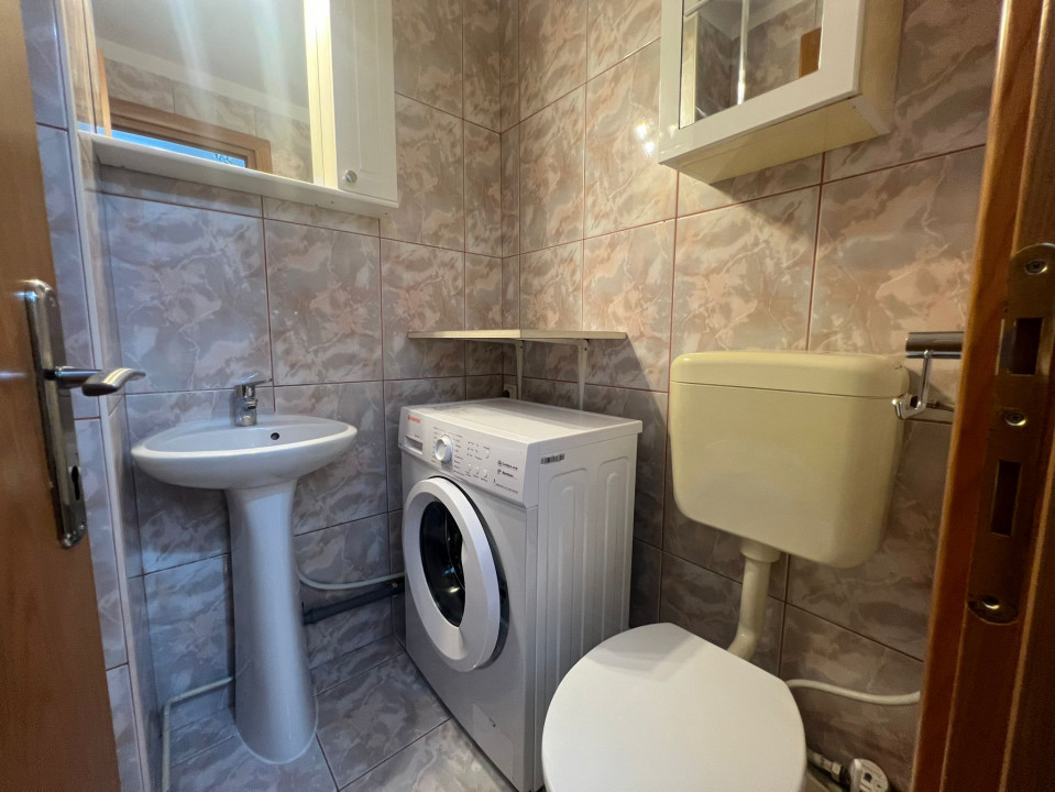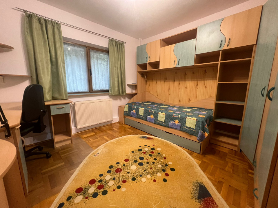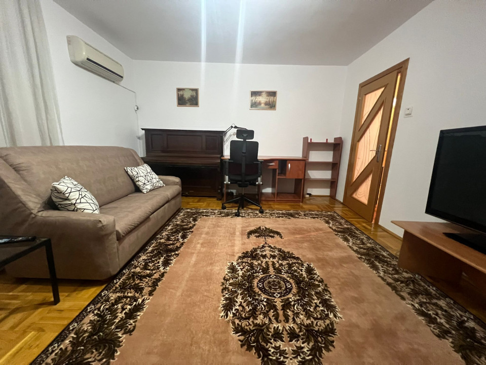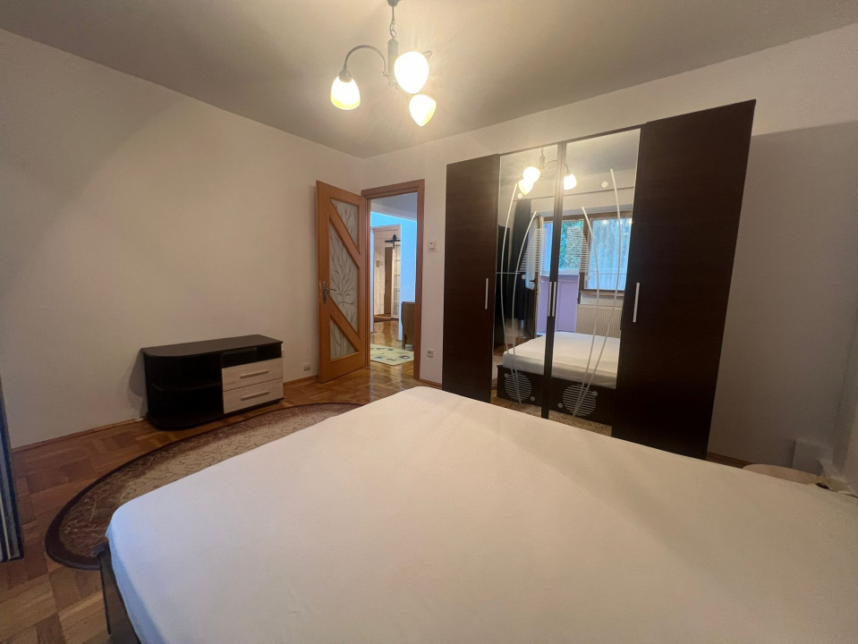 Dispune de un living luminos echipat cu o canapea, 2 fotolii, un pian, un birou cu scaun, comoda, TV, AC, 2 dormitoare mobilate complet cu pat + sifonier, 1 baie cu geam si 1 wc de serviciu cu masina de spalat rufe.