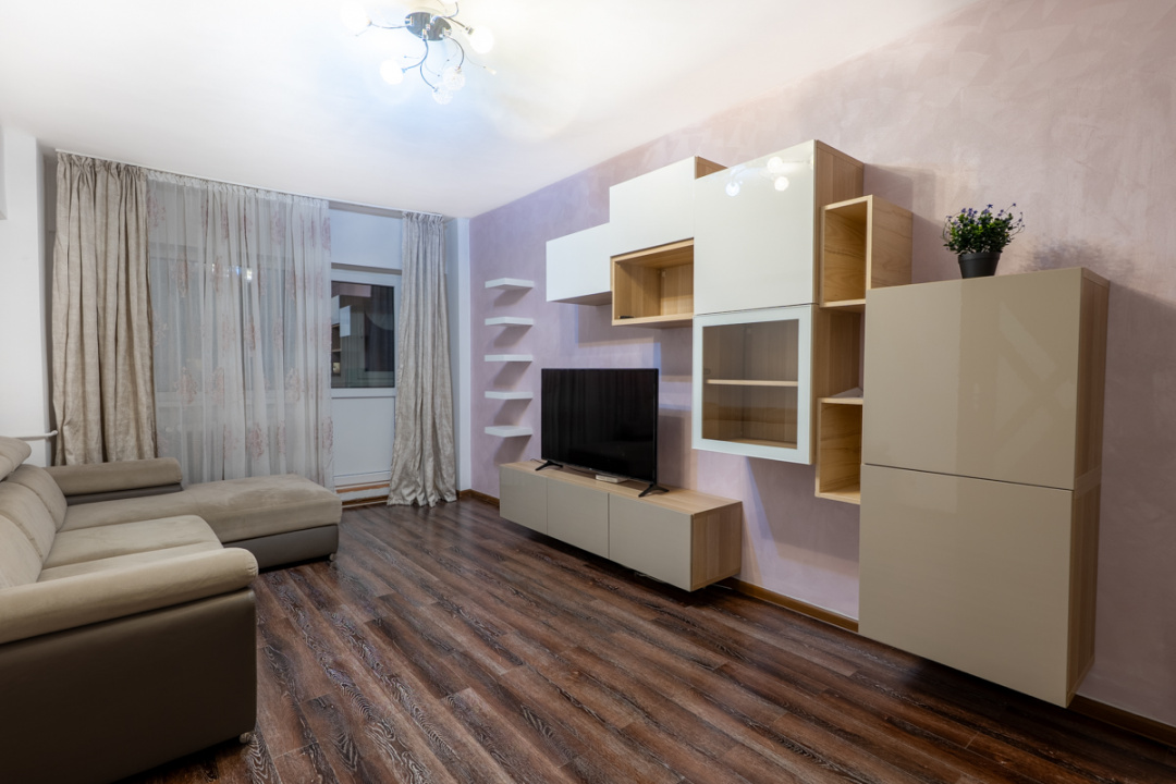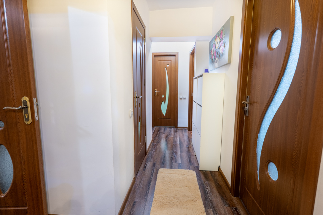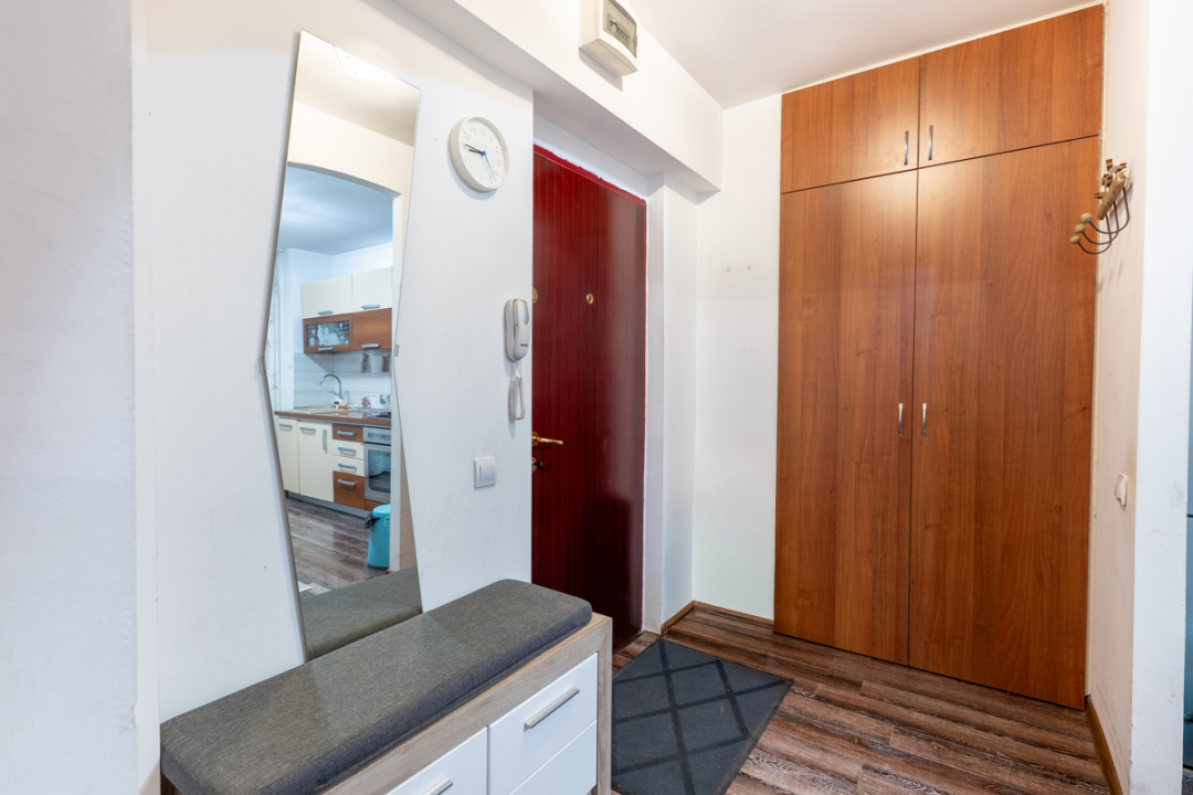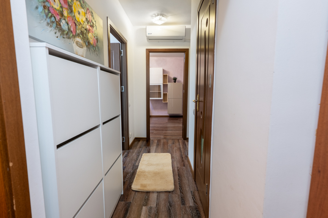 Compartimentarea este eficienta si practica. Accesul in imobil se face intr-un hol spatios, dotat cu spatii de depozitare si pantofar, din care se intra atat in bucatarie, cat si in living. Livingul este mobilat cu canapea extensibila si biblioteca, avand acces catre primul balcon. Bucataria generoasa, cu o suprafata de 8,85 mp, este complet mobilata si utilata, dispune de loc de luat masa si acces catre al doilea hol.
